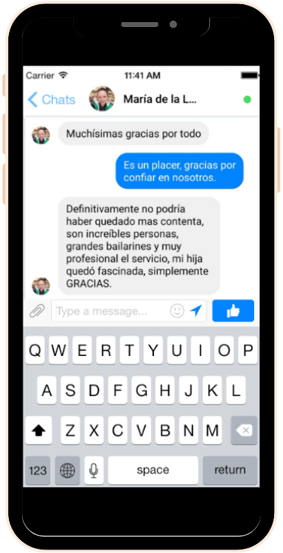 "Definitivamente no podría haber quedado mas contenta, son increíbles personas, grandes bailarines y muy profesional el servicio, mi hija quedó fascinada, simplemente GRACIAS"